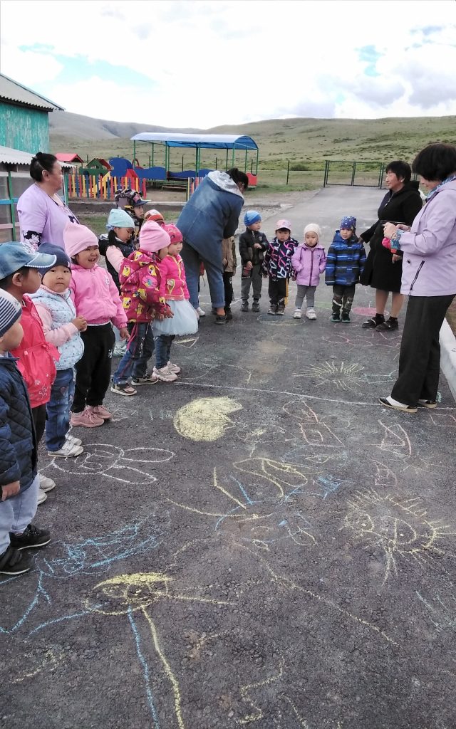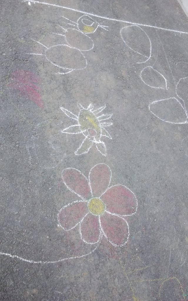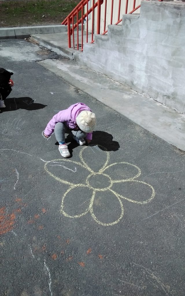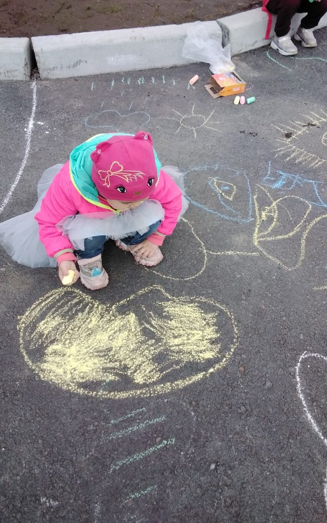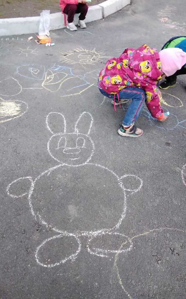 Наши воспитатели и помощники воспитателей постарались радовать детей. На асфальте в территории детского сада дети нарисовали рисунки на разные темы. Также играли в игру «Надуй шарик».